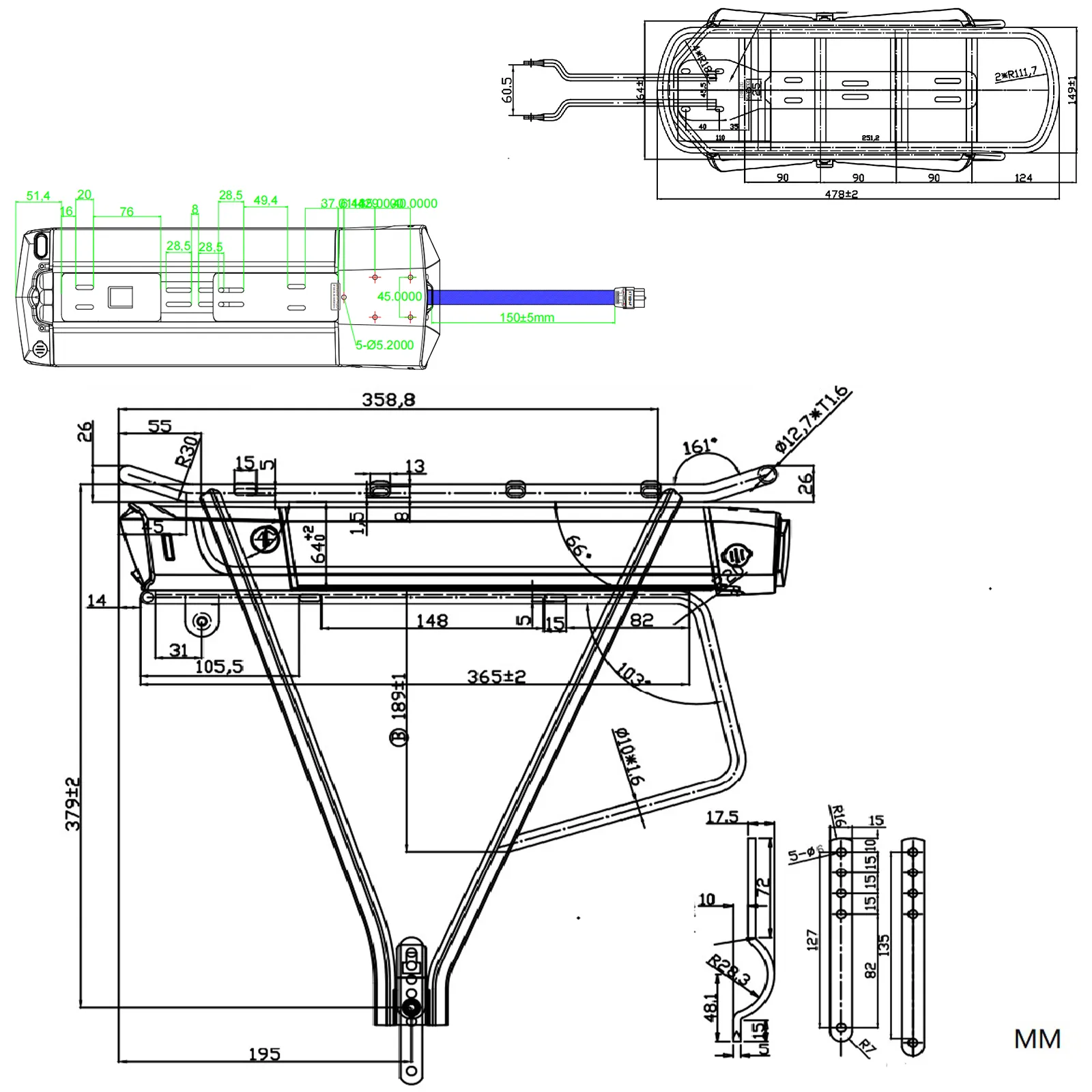 • befoglaló méret: 470*190*400 mm (ebből akkumulátor: 390*160*50 mm)